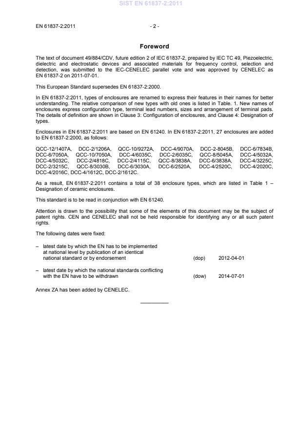 EN 61837-2:2011 is a standard published by CLC. Its full title is "Surface mounted piezoelectric devices for frequency control and selection - Standard outlines and terminal lead connections - Part 2: Ceramic enclosures". This standard covers: IEC 61837-2:2011 deals with standard outlines and terminal lead connections as they apply to surface-mounted devices (SMD) for frequency control and selection in ceramic enclosures, and is based on IEC 61240. In this edition, types of enclosures are renamed to express their features in their names for better understanding. The relative comparison of new types with old ones is listed in Table 1. New names of enclosures express configuration type, terminal lead numbers, sizes and arrangement of terminal pads. The details of definition are shown in Clause 3: Configuration of enclosures, and Clause 4: Designation of types. Enclosures in this new edition are based on IEC 61240. In this standard, 27 enclosures are added to the first edition of IEC 61837-2. This publication is to be read in conjunction with IEC 61240:1994.