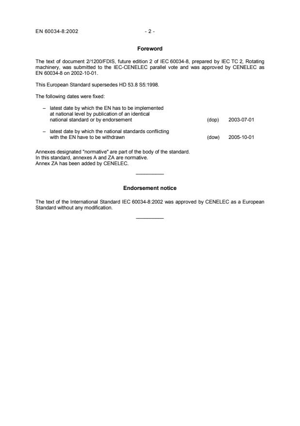 EN 60034-8:2002 has the following relationships with other standards: It is inter standard links to HD 53.8 S5:1998, EN 60034-8:2007. Understanding these relationships helps ensure you are using the most current and applicable version of the standard.