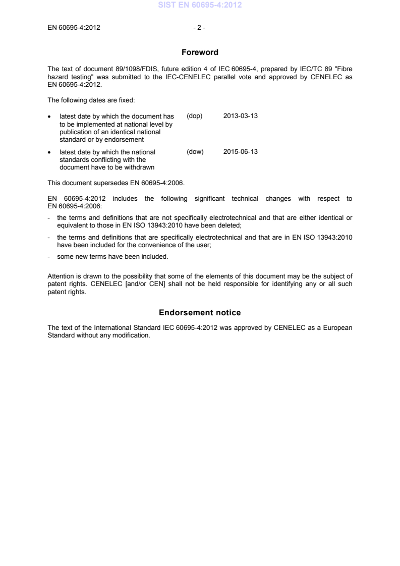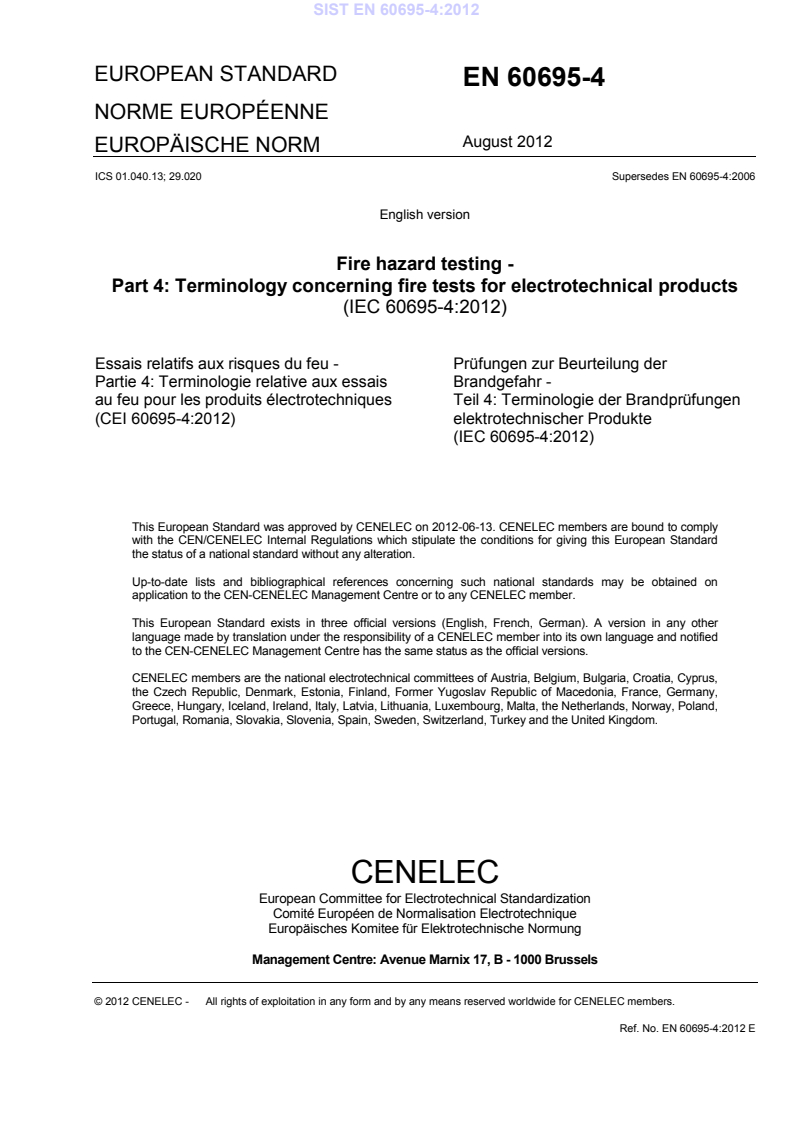 The text of the International Standard IEC 60695-4:2012 was approved by CENELEC as a European