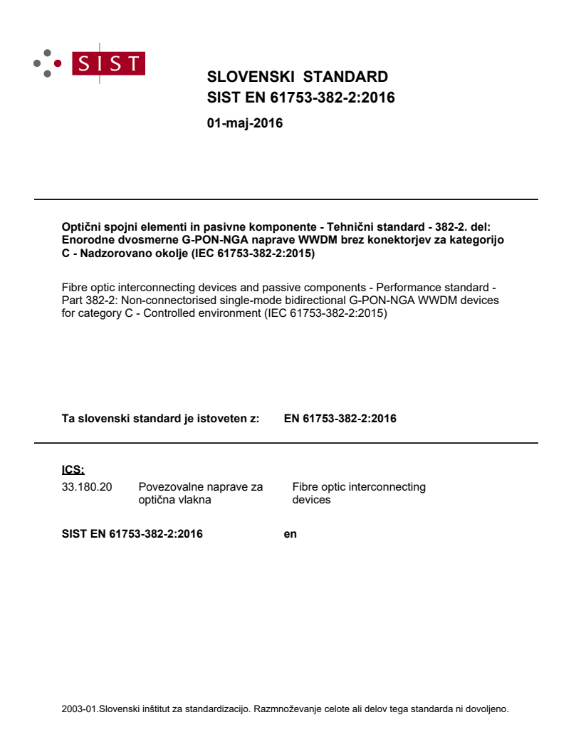 EN 61753-382-2:2016 (IEC 61753-382-2:2015) - Fibre optic interconnecting devices and passive components - Performance standard - Part 382-2: Non-connectorized single‑mode bidirectional G‑PON‑NGA WWDM devices for category C (Controlled environment)