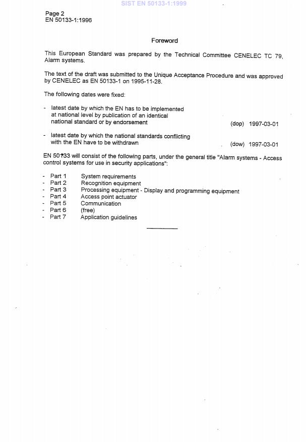 EN 50133-1:1996 is a standard published by CLC. Its full title is "Alarm systems - Access control systems for use in security applications - Part 1: System requirements". This standard covers: This standard specifies requirements for automated access control systems and components in and around buildings. It includes: system architecture and general requirements of an access control system for security applications, requirements for functions, definition of the environmental and electromagnetic compatibility conditions, requirements for communication of an access control with others, such as access point actuators and sensors, alarm system, etc... The standard does not apply to access point actuators and sensors