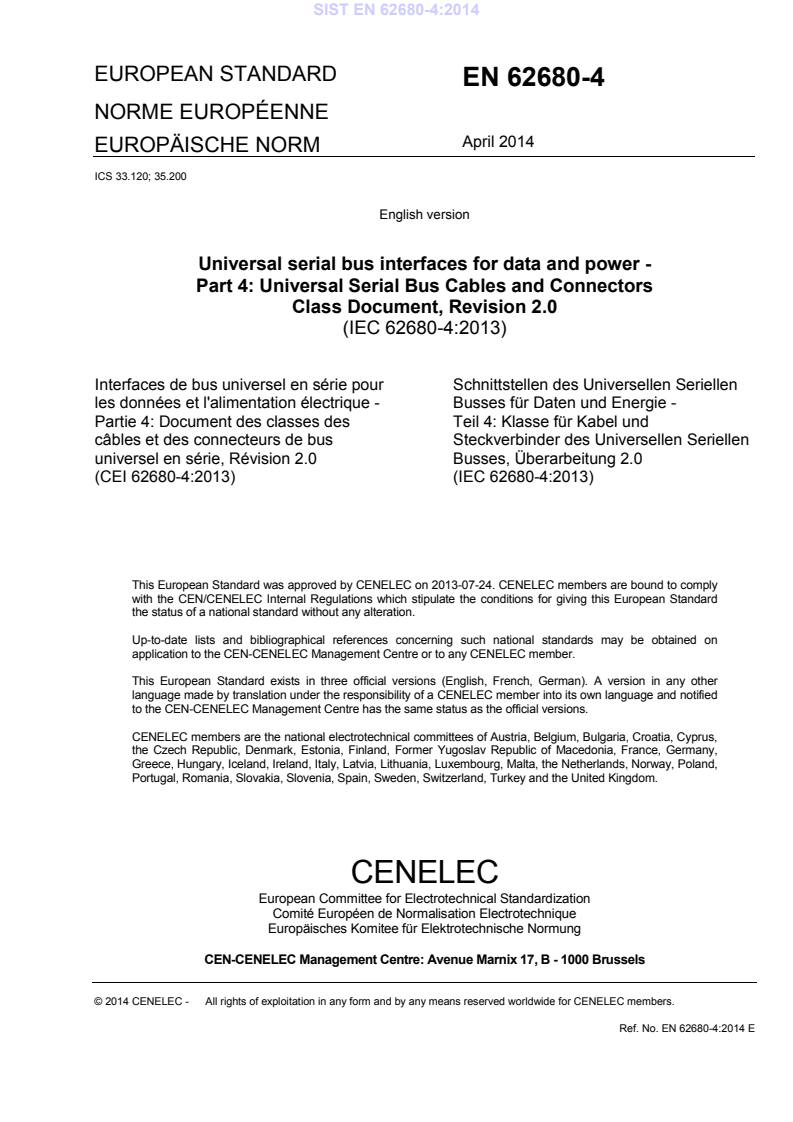 EN 62680-4:2014 is a standard published by CLC. Its full title is "Universal serial bus interfaces for data and power - Part 4: Universal Serial Bus Cables and Connectors Class Document, Revision 2.0". This standard covers: IEC 62680-4:2013 describes the mechanical, electrical, environmental, design and performance criteria and voluntary supplier compliance requirements for USB connectors, cable and fabricated cable assemblies. In addition, this document provides detailed requirements for the design, approval and implementation of application specific USB connectors and fabricated cable assemblies.