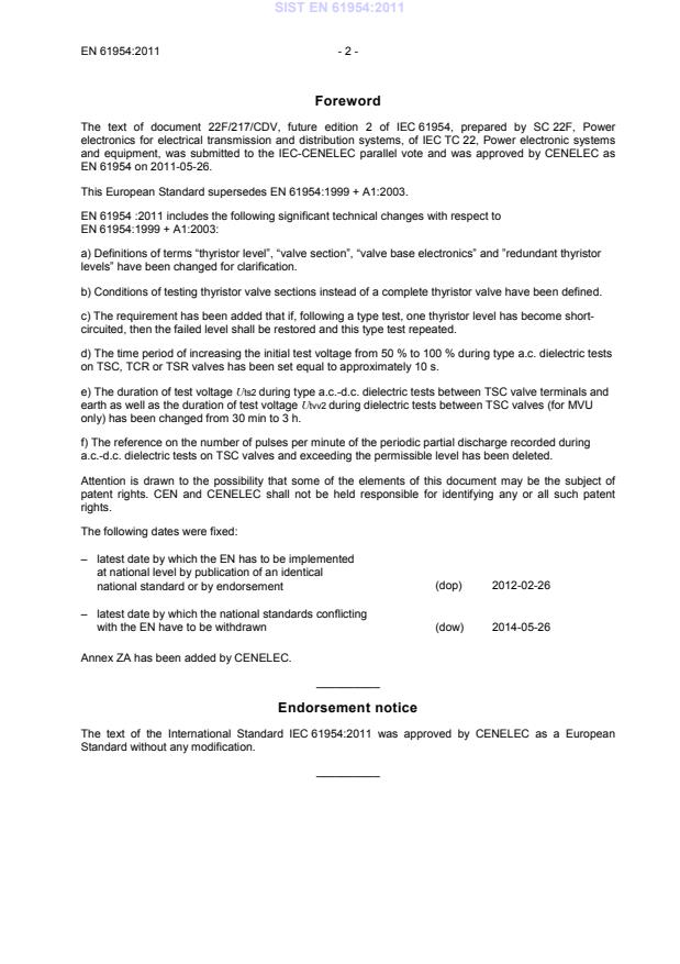 EN 61954:2011 is a standard published by CLC. Its full title is "Static VAR compensators (SVC) - Testing of thyristor valves". This standard covers: IEC 61954:2011 defines type, production and optional tests on thyristor valves used in thyristor controlled reactors (TCR), thyristor switched reactors (TSR) and thyristor switched capacitors (TSC) forming part of static VAR compensators (SVC) for power system applications. The requirements of the standard apply both to single valve units (one phase) and to multiple valve units (several phases). This edition includes the following significant technical changes with respect to the previous edition: a) Definitions of terms 'thyristor level', 'valve section', 'valve base electronics' and 'redundant thyristor levels' have been changed for clarification; b) Conditions of testing thyristor valve sections instead of a complete thyristor valve have been defined; c) The requirement has been added that if, following a type test, one thyristor level has become short-circuited, then the failed level shall be restored and this type test repeated; d) The time period of increasing the initial test voltage from 50 % to 100 % during type a.c. dielectric tests on TSC, TCR or TSR valves has been set equal to approximately 10 s; e) The duration of test voltage Uts2 during type a.c.-d.c. dielectric tests between TSC valve terminals and earth as well as the duration of test voltage Utvv2 during dielectric tests between TSC valves (for MVU only) has been changed from 30 min to 3 h; f) The reference on the number of pulses per minute of the periodic partial discharge recorded during a.c.-d.c. dielectric tests on TSC valves and exceeding the permissible level has been deleted.