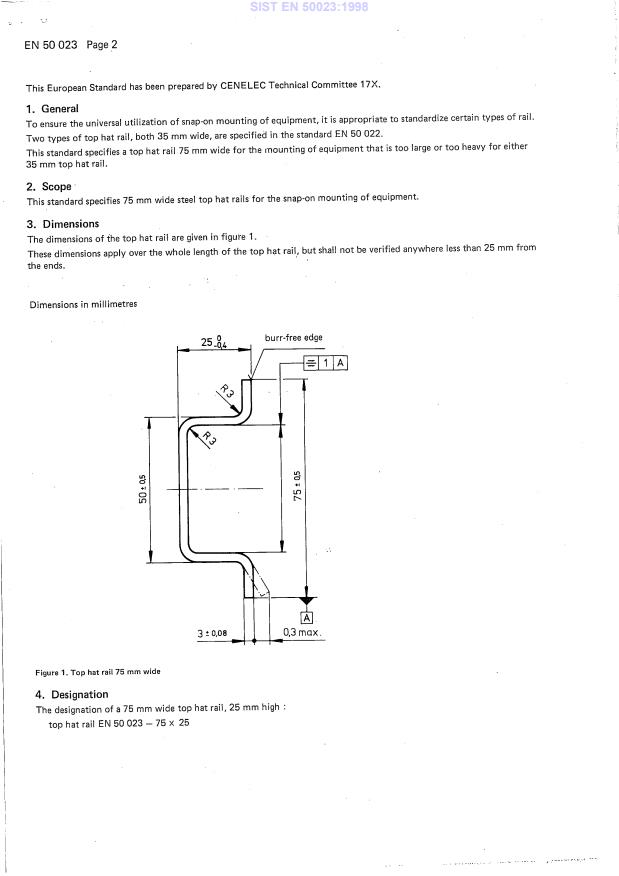 EN 50023:1977 is a standard published by CLC. Its full title is "Low-voltage switchgear and controlgear for industrial use - Mounting rails - Top hat rails 75 mm wide for snap-on mounting of equipment". This standard covers: D105/023: EN withdrawn