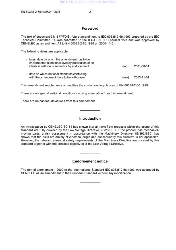 This amendment A1 modifies the European Standard EN 60335-2-66:1995; it was approved by
