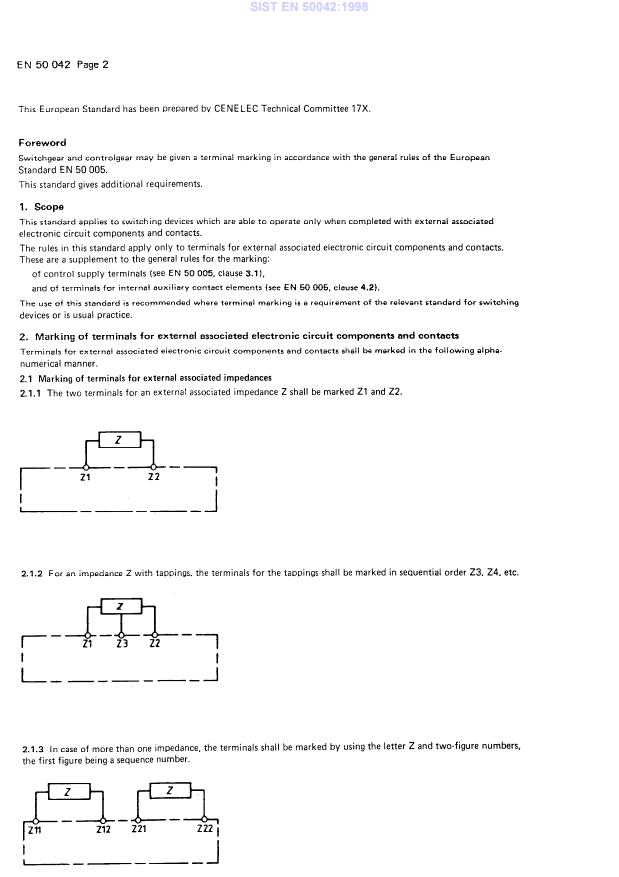 EN 50042:1980 is a standard published by CLC. Its full title is "Low-voltage switchgear and controlgear for industrial use - Terminal marking - Terminals for external associated electronic circuit components and contacts". This standard covers: This standard applies to switching devices which are able to operate only when completed with external associated electronic circuit components and contacts. The rules in this standard apply only to terminals for external associated electronic circuit components and contacts. These are a supplement to the general rules for the marking: of control supply terminals (see EN 50 005 clause 3.1), and of terminals for internal auxiliary contact elements (see EN 50 005, clause 4.2). The use of this standard is recommended where terminal marking is a requirement of the relevant standard for switching devices or is usual practice