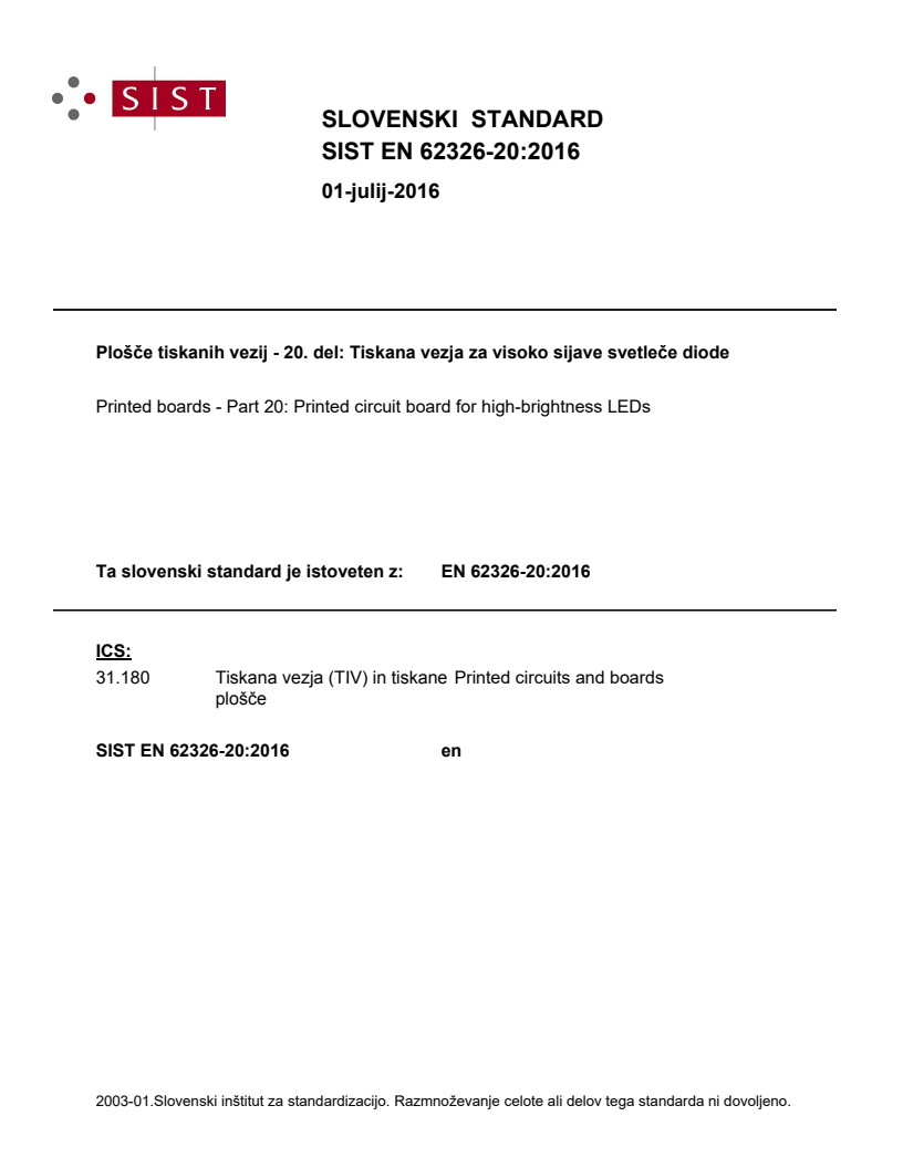 EN 62326-20:2016 is a standard published by CLC. Its full title is "Printed boards - Part 20: Printed circuit boards for high-brightness LEDs". This standard covers: IEC 62326-20:2016 specifies the properties of the printed circuit board (hereafter described as PCB) for high-brightness LEDs. Many aspects of the PCB for high-brightness LEDs are identical with those of ordinary PCBs, therefore, some aspects of this standard also describe general aspects. This edition includes the following significant technical changes with respect to the previous edition: a) this edition focuses on the technical content of the printed circuit board for high-brightness LEDs; b) the figures related to the printed circuit board for high-brightness LEDs have been refined.