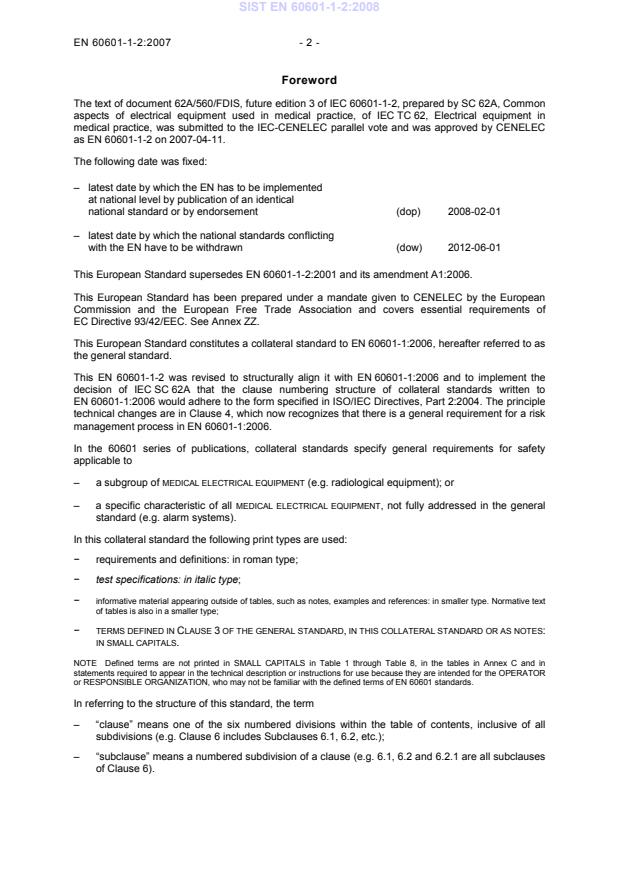 This European Standard has been prepared under a mandate given to CENELEC by the European Commission and the European Free Trade Association and covers essential requirements of EC Directive 93/42/EEC. See Annex ZZ. This European Standard constitutes a collateral standard to EN 60601-1:2006, hereafter referred to as the general standard. This EN 60601-1-2 was revised to structurally align it with EN 60601-1:2006 and to implement the decision of IEC SC 62A that the clause numbering structure of collateral standards written to EN 60601-1:2006 would adhere to the form specified in ISO/IEC Directives, Part 2:2004. The principle technical changes are in Clause 4, which now recognizes that there is a general requirement for a risk management process in EN 60601-1:2006. In the 60601 series of publications, collateral standards specify general requirements for safety applicable to – a subgroup of MEDICAL ELECTRICAL EQUIPMENT (e.g. radiological equipment); or – a specific characteristic of all MEDICAL ELECTRICAL EQUIPMENT, not fully addressed in the general standard (e.g. alarm systems). In this collateral standard the following print types are used: − requirements and definitions: in roman type; − test specifications: in italic type; − informative material appearing outside of tables, such as notes, examples and references: in smaller type. Normative text of tables is also in a smaller type; − TERMS DEFINED IN CLAUSE 3 OF THE GENERAL STANDARD, IN THIS COLLATERAL STANDARD OR AS NOTES: IN SMALL CAPITALS. NOTE Defined terms are not printed in SMALL CAPITALS in Table 1 through Table 8, in the tables in Annex C and in statements required to appear in the technical description or instructions for use because they are intended for the OPERATOR or RESPONSIBLE ORGANIZATION, who may not be familiar with the defined terms of EN 60601 standards. In referring to the structure of this standard, the term – “clause” means one of the six numbered divisions within the table of contents, inclusive of all subdivisions (e.g. Clause 6 includes Subclauses 6.1, 6.2, etc.); –