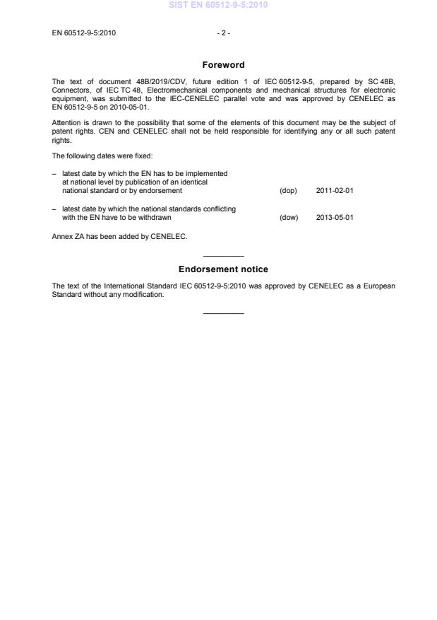 2013-05-01 Annex ZA has been added by CENELEC. __________ Endorsement notice The text of the International Standard IEC 60512-9-5:2010 was approved by CENELEC as a European Standard without any modification. __________ SIST EN 60512-9-5:2010
