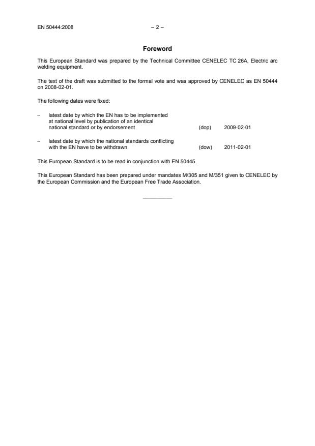 – 3 – EN 50444:2008 Contents 1 Scope.6 2 Normative references.6 3 Terms and definitions.6 3.1 General.6 3.2 Specific for arc welding and similar applications.8 4 Physical quantities, units and constants.9 4.1 Quantities and units.9 4.2 Constants.9 5 Assessment procedures.9 5.1 Arc welding equipment components to be tested.9 5.2 Assessment conditions.9 5.3 Averaging.9 5.4 Pulsed or non-sinusoidal welding current.9 5.4.1 General.9 5.4.2 Summation for basic restriction assessment.10 5.4.2.1 Summation of current density components without phase information.10 5.4.2.2 Summation of currents density components including phase information.10 5.4.2.3 Summation of specific absorption rate (SAR) components.11 5.4.3 Summation for reference level assessment.11 5.4.3.1 Summation for stimulation effects without phase information.11 5.4.3.2 Effective reference level method.12 5.4.3.3 Summation for stimulation effects including phase information.13 5.4.3.4 Summation for thermal effects.13 5.4.4 Equivalent frequency of induced current density waveforms.13 5.5 Conductivity of living tissue.14 5.6 Frequency range limitations.14 5.7 Application of assessment procedures.15 5.8 Measurements.16 5.8.1 Measuring equipment.16 5.8.2 Static field measurements.17 5.8.3 Time domain field measurements.17 5.8.4 Broadband field measurements.17 5.8.5 Frequency selective field measurements.17 5.8.6 Time domain weighted field measurements.18 5.9 Analytical calculations.18 5.9.1 General information.18 5.9.2 Derivation of magnetic field based on welding current.18 5.9.3 Derivation of induced current density based on magnetic field.19