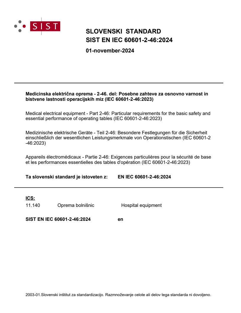 Keywords: EN IEC 60601-2-46:2024, operating tables, medical electrical equipment, safety requirements, IEC 60601, EMC, mechanical hazards, conformity, medical device standards.