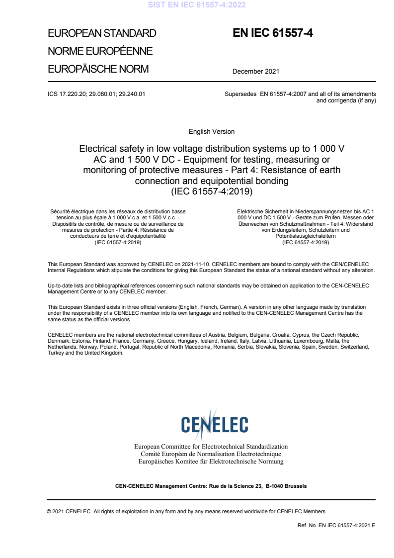- Published as EN IEC 61557-4:2021 by CENELEC based on IEC 61557-4:2019.