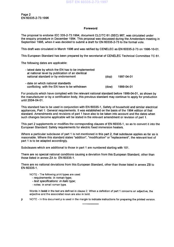 EN 60335-2-73:1996 is a standard published by CLC. Its full title is "Safety of household and similar electrical appliances - Part 2-73: Particular requirements for fixed immersion heaters". This standard covers: Deals with the safety of fixed immersion heaters for household and similar purposes intended for installation in a water tank for heating water to a temperature below its boiling-point. The rated voltage is not more than 250 V for single-phase immersion heaters and 480 V for other immersion heaters.