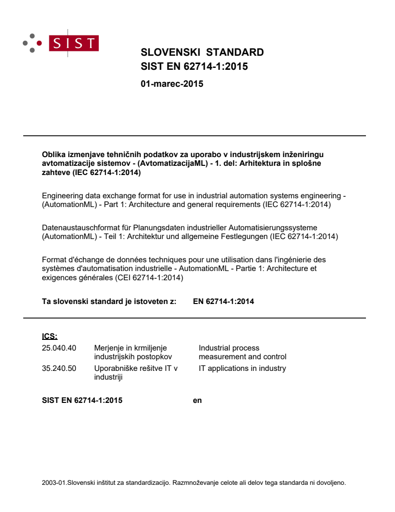Oblika izmenjave tehničnih podatkov za uporabo v industrijskem inženiringu avtomatizacije sistemov - (AvtomatizacijaML) - 1. del: Arhitektura in splošne zahteve (IEC 62714-1:2014)