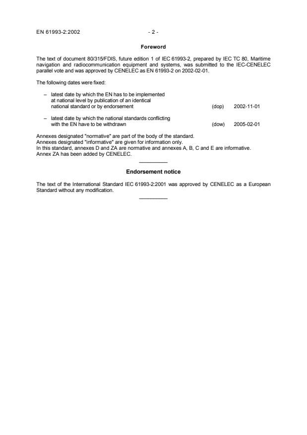 EN 61993-2:2002 has the following relationships with other standards: It is inter standard links to EN 61993-2:2013, EN 60945:1997, EN 61162-2:1998, EN 61162-3:2008, EN 61162-1:2000, EN 61108-2:1998, EN 61108-4:2004, EN 61993-1:1999, EN 62287-1:2006. Understanding these relationships helps ensure you are using the most current and applicable version of the standard.