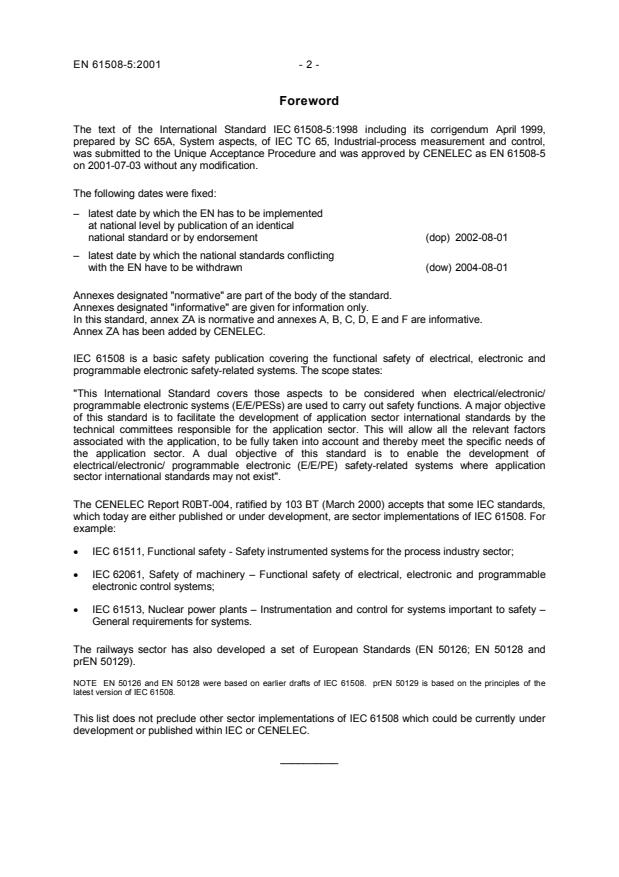 - 3 -EN 61508-5:2001Endorsement noticeThe text of the International Standard IEC 61508-5:1998 including its corrigendum April 1999 wasapproved by CENELEC as a European Standard without any modification.__________