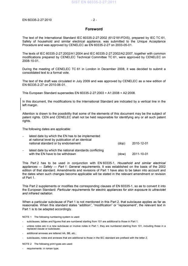 Part 1: General requirements. It was established on the basis of the 2002 edition of that standard. Amendments and revisions of Part 1 have also to be taken into account and the dates when such changes become applicable will be stated in the relevant amendment or revision of Part 1. This Part 2 supplements or modifies the corresponding clauses of EN 60335-1, so as to convert it into the European Standard: Particular requirements for electric appliances for skin exposure to ultraviolet and infrared radiation. When a particular subclause of Part 1 is not mentioned in this Part 2, that subclause applies as far as reasonable. When this standard states “addition”, “modification” or “replacement”, the relevant text in Part 1 is to be adapted accordingly. NOTE 1 The following numbering system is used: - subclauses, tables and figures that are numbered starting from 101 are additional to those in Part 1; - unless notes are in a new subclause or involve notes in Part 1, they are numbered starting from 101, including those in a replaced clause or subclause; - additional annexes are lettered AA, BB, etc.; - subclauses, notes and annexes that are additional to those in the IEC standard are prefixed with the letter Z. NOTE 2 The following print types are used: - requirements: in roman type; SIST EN 60335-2-27:2011