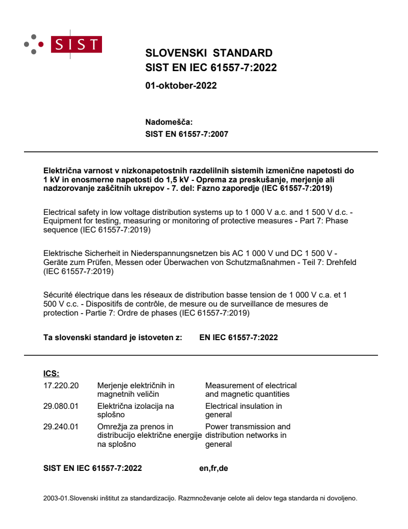 Električna varnost v nizkonapetostnih razdelilnih sistemih izmenične napetosti do 1 kV in enosmerne napetosti do 1,5 kV - Oprema za preskušanje, merjenje ali nadzorovanje zaščitnih ukrepov - 7. del: Fazno zaporedje (IEC 61557-7:2019)