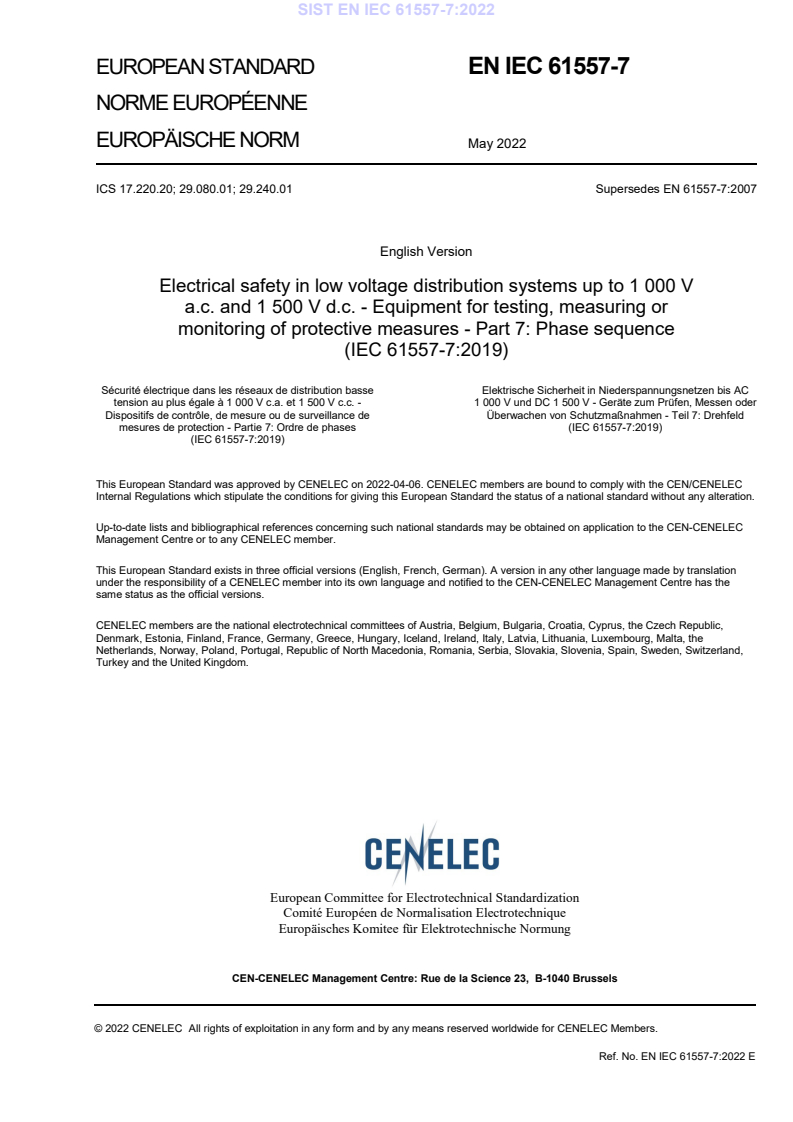 EN IEC 61557-7:2022 is a standard published by CLC. Its full title is "Electrical safety in low voltage distribution systems up to 1 000 V a.c. and 1 500 V d.c. - Equipment for testing, measuring or monitoring of protective measures - Part 7: Phase sequence". This standard covers: IEC 61557-7:2019 is available as IEC 61557-7:2019 RLV which contains the International Standard and its Redline version, showing all changes of the technical content compared to the previous edition.IEC 61557-7:2019 specifies the requirements applicable to measuring equipment for testing the phase sequence in three-phase distribution systems. Indication of the phase sequence can be mechanical, visual and/or audible. This document does not apply to additional measurements for other quantities. It does not apply to monitoring relays. IEC 61557-7:2019 cancels and replaces the second edition published in 2007. This edition constitutes a technical revision. This edition includes the following changes with respect to the previous edition: a) alignment of the structure with that of the whole IEC 61557 series; b) updated requirements in 4.3 in accordance with new editions of IEC 61010-1 and IEC 61010-031; c) the information on markings was extended; d) the information on the operating instructions was extended; e) complement to the information on the testing of leads; f) test leads for insulated conductors were introduced; g) Annex B was added with information on phase sequence tests and indications.