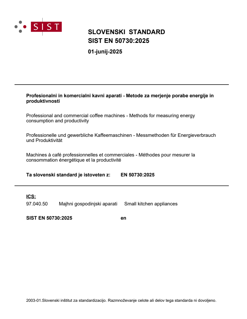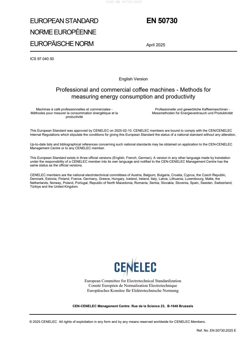 Keywords: EN 50730:2025, professional coffee machines, energy consumption measurement, productivity test methods, CLC, CENELEC.