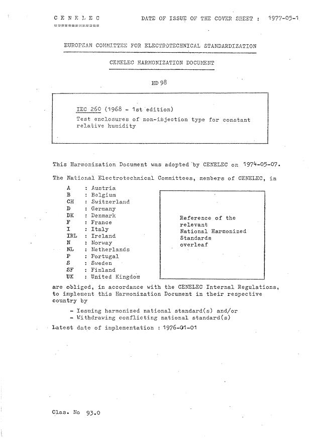 HD 98 S1:1977 has the following relationships with other standards: It is inter standard links to EN 60691:1995, EN 60674-2:1998/A1:2001, EN 60491:1995, EN 61340-2-3:2000. Understanding these relationships helps ensure you are using the most current and applicable version of the standard.