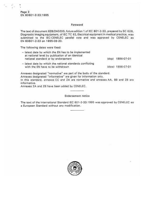EN 60601-2-33:1995 is a standard published by CLC. Its full title is "Medical electrical equipment - Part 2: Particular requirements for the safety of magnetic resonance equipment for medical diagnosis". This standard covers: Establishes requirements for the safety of magnetic resonance equipment to provide protection for the patient, the operator, staff associated with magnetic resonance equipment and the general public. It also provides methods for demonstrating compliance with those requirements.