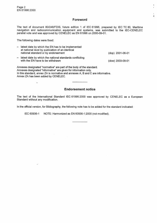 EN 61996:2000 is a standard published by CLC. Its full title is "Maritime navigation and radiocommunication equipment and systems - Shipborne voyage data recorder (VDR) - Performance requirements - Methods of testing and required test results". This standard covers: Specifies the minimum performance requirements, technical characteristics and methods of testing and required test results, for shipborne voyage data recorder (VDR) installations as required by the International Convention for Safety of Life at Sea (SOLAS). Takes into account IMO resolution A.694 as well as the applicable parts of the performance standards included in IMO Resolution A.861 and is associated with EN 60945.