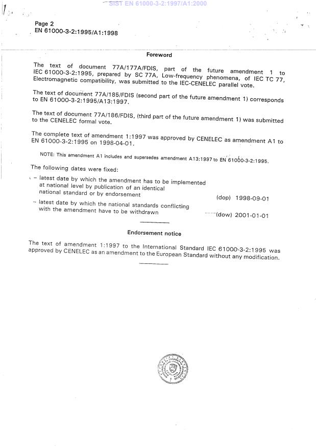 EN 61000-3-2:1995/A1:1998 is a amendment published by CLC. Its full title is "Electromagnetic compatibility (EMC) - Part 3-2: Limits - Limits for harmonic current emissions (equipment input current up to and including 16 A per phase)". This standard covers: EN following parallel vote * Includes and supersedes A13:1997 * Superseded by EN 61000-3-2:2000