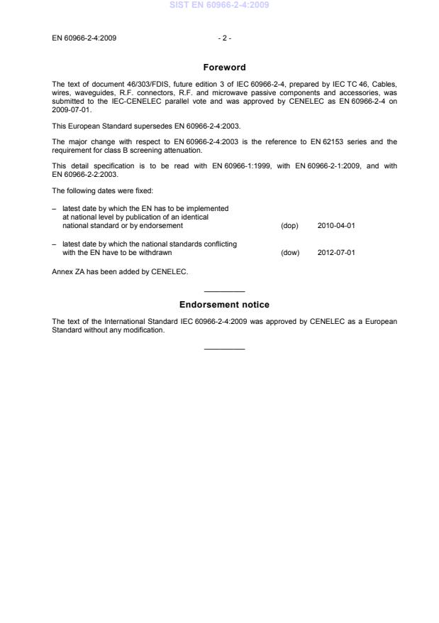 IEC 60966-2-4:2009(E) applies to flexible coaxial cables described in IEC 60096-2. It relates to cable assemblies for radio and TV receivers, and in particular to the cable assemblies subfamily 9,52. (IEC 61169-2). These cable assemblies are used as described in IEC 60728 4. This detail specification gives subfamily requirements and severities which shall be applied. This third edition cancels and replaces the second edition published in 2003 and constitutes a technical revision. The major change with respect to the second edition is the reference to IEC 62153 and the requirement for class B screening attenuation.