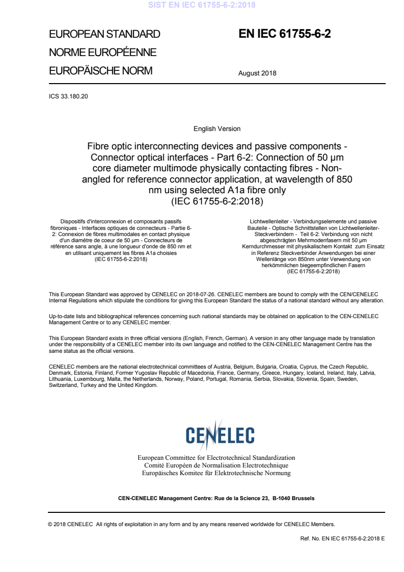 EN IEC 61755-6-2:2018 specifies the dimensional limits and optical-interface requirements for reference connectors used with 50 μm core diameter multimode, physically contacting (PC), non‑angled fibres at 850 nm, using selected IEC 60793‑2‑10 A1a fibre only. The document defines one performance grade of reference connector intended to reduce variability in fibre‑to‑fibre interconnection attenuation measurements performed in factory or field environments.