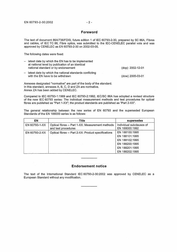 EN 60793-2-30:2002 has the following relationships with other standards: It is inter standard links to EN 60793-2-30:2009, EN 60793-1-20:2002, EN 60793-1-51:2002, EN 60793-1-53:2002, EN 60793-2:2004, EN 60793-1-30:2002, EN 60793-1-22:2002, EN 60793-1-40:2003, EN 60793-1-50:2002, EN 60793-1-52:2002, EN 60793-1-21:2002, EN 60793-1-46:2002, EN 62149-6:2003, EN 60793-1-41:2003. Understanding these relationships helps ensure you are using the most current and applicable version of the standard.