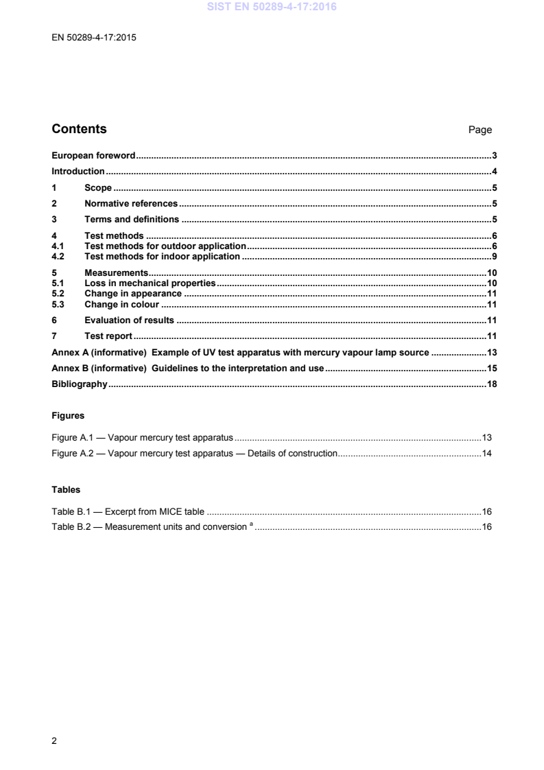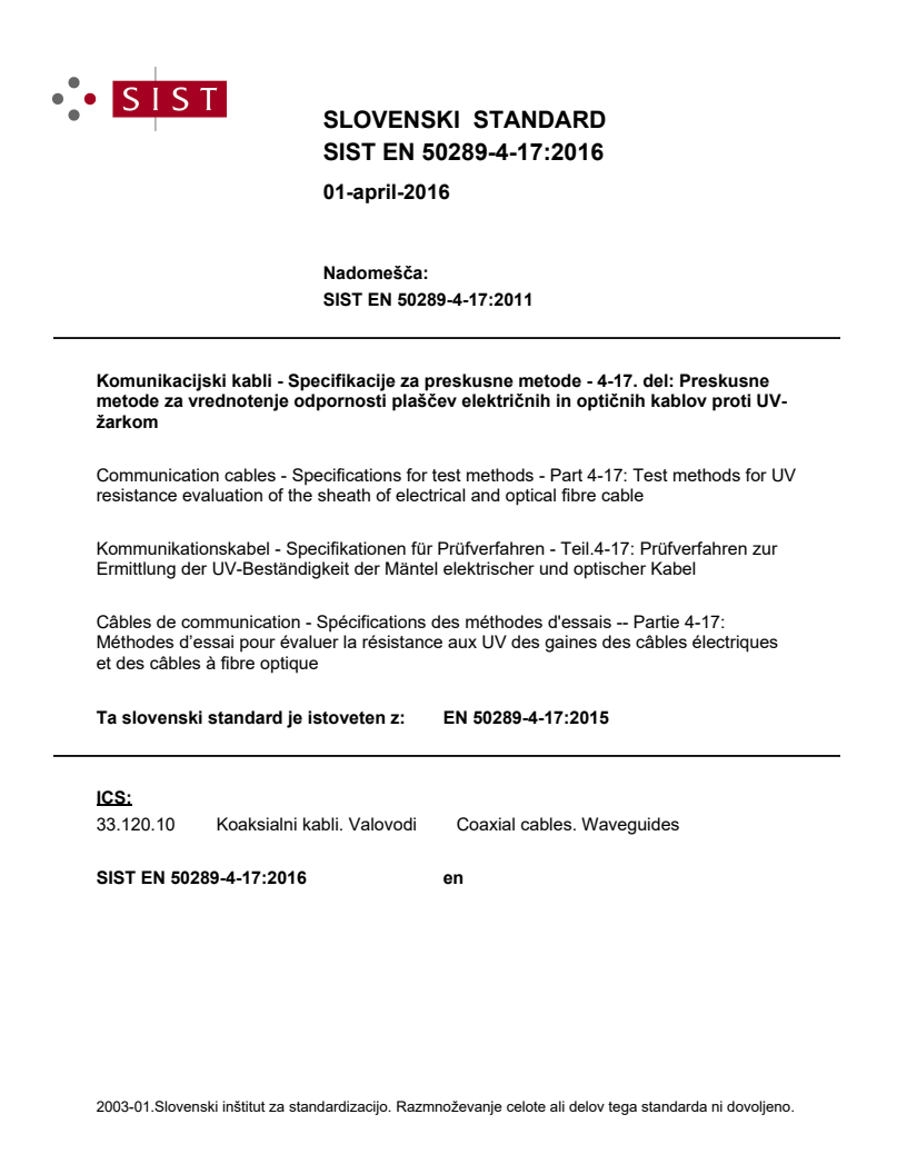 EN 50289-4-17:2015 is a standard published by CLC. Its full title is "Communication cables - Specifications for test methods - Part 4-17: Test methods for UV resistance evaluation of the sheath of electrical and optical fibre cable". This standard covers: This European Standard describes three methods to determine the UV resistance of sheath materials for electric and for optical fibre cables. These tests apply for outdoor and indoor cable applications according to the product standard. The samples of sheath are taken from the finished cables. Although this test method European Standard is written principally for communication cables, it may be used for energy cables if called up by the relevant product standard. Where a sheath is of cross-linked (thermosetting) material, it should be recalled that the preparation of moulded plaques must be made before crosslinking. Methods differ by the nature of the UV source. Due to the excessive time to failure, the methods described are inappropriate to products where UV resistance is conferred by ≥ 2,0 % carbon black meeting the dispersion requirements defined in EN 50290-2-24.