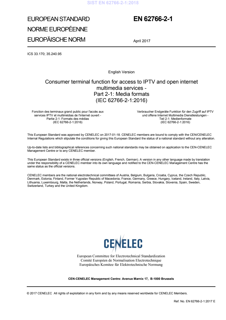EN 62766-2-1:2017 is a standard published by CLC. Its full title is "Consumer terminal function for access to IPTV and open internet multimedia services - Part 2-1: Media formats". This standard covers: IEC 62766-2-1:2016 specifies formats for the audio/video content provided by IPTV services using fixed line access networks or mobile access networks and voice and video telephony services. It does not apply to the broadcast channel input of hybrid devices except where explicitly specified.It defines formats for the delivery of 3D video. At the present time, delivery to fixed terminals is targeted. It defines the media formats utilised on the UNI reference point UNIT-17 of the Open IPTV Forum functional architecture.