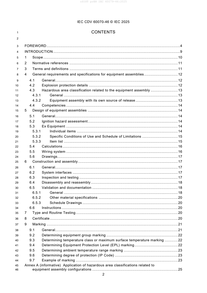prEN IEC 60079-46:2025 - "Explosive atmospheres - Part 46: Equipment assemblies" is a CLC/IEC committee draft (CDV) for a first-edition standard that upgrades IEC TS 60079-46:2017 into a full IEC standard. It defines requirements for the design, construction, testing, documentation and marking of electrical and non-electrical equipment assemblies intended for use in explosive atmospheres. The document addresses assemblies that may be entirely or partially within hazardous areas and clarifies manufacturer responsibilities, competency, and certification expectations.
