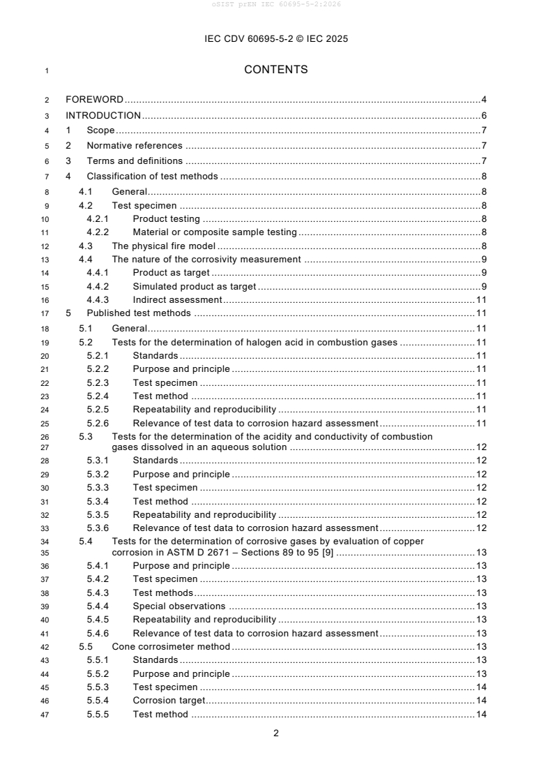 prEN IEC 60695-5-2:2026, titled Fire hazard testing – Part 5-2: Corrosion damage effects of fire effluent – Summary and relevance of test methods, is an essential standard developed by the International Electrotechnical Commission (IEC) with CENELEC involvement. It addresses the evaluation of the corrosive effects that fire effluents exert on materials, components, and electrotechnical products by summarizing established laboratory test methods. Assessing and mitigating corrosion caused by fire effluent is vital for ensuring the safety, performance, and longevity of electrical and electronic systems exposed to fire scenarios.
