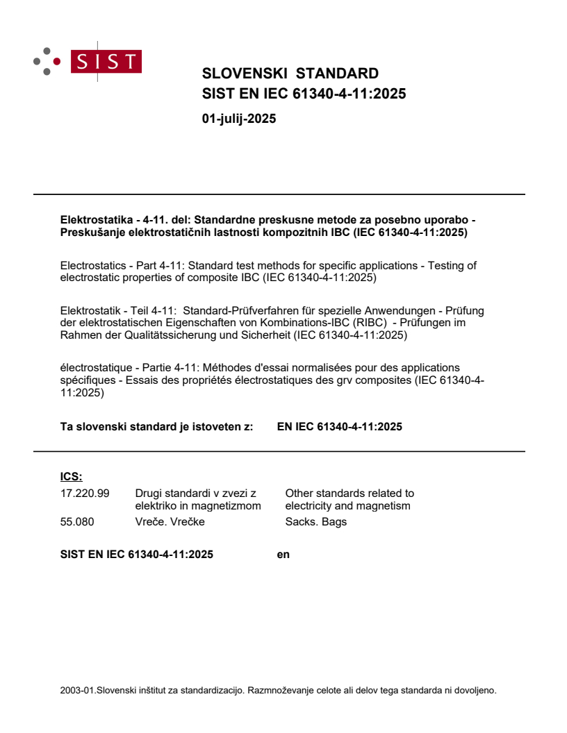 Elektrostatika - 4-11. del: Standardne preskusne metode za posebno uporabo - Preskušanje elektrostatičnih lastnosti kompozitnih IBC (IEC 61340-4-11:2025)