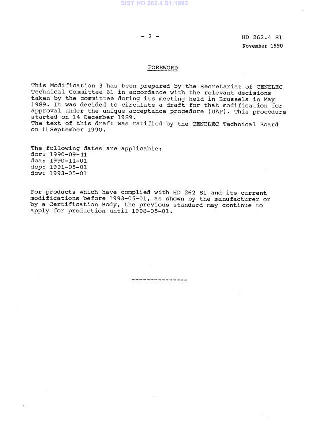 HD 262.4 S1:1990 is a standardization document published by CLC. Its full title is "Modification No. 3 to HD 262 S1". This standard covers: Superseded by EN 60335-2-74:1996