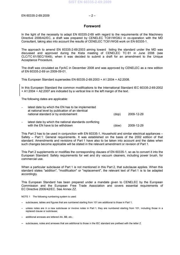 listing the standard under the MD was discussed and approved during the Kista meeting of CENELEC TC 61 in June 2008 (see CLC/TC 61/SEC/1649), when it was decided to submit a draft for an amendment to the Unique Acceptance Procedure. The draft was circulated as FprAC in December 2008 and was approved by CENELEC as a new edition of EN 60335-2-69 on 2009-09-01. This European Standard supersedes EN 60335-2-69:2003 + A1:2004 + A2:2008. In this European Standard the common modifications to the International Standard IEC 60335-2-69:2002 + A1:2004 + A2:2007 are indicated by a vertical line in the left margin of the text. The following dates are applicable: – latest date by which the EN has to be implemented at national level by publication of an identical national standard or by endorsement
