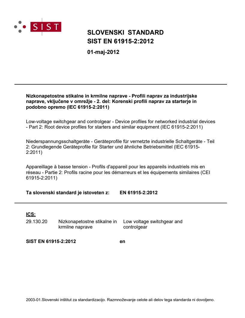 EN 61915-2:2012 (identical to IEC 61915-2:2011) defines root device profiles for starters and similar equipment used in low‑voltage switchgear and controlgear. It is part of the IEC 61915 series on device profiles for networked industrial devices and builds on the general rules in IEC 61915-1. The standard gives a common set of functionality (data and behaviour) so that motor starters, soft starters and related devices can be represented consistently on industrial networks for configuration, monitoring and control.