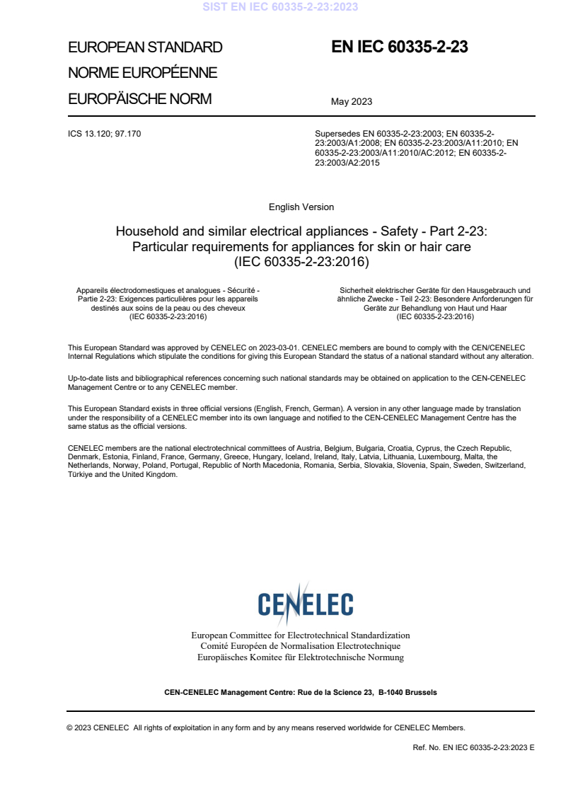 - National/adopted versions and related CENELEC documents (EN IEC 60335-2-23:2023/A1:2023 and A11:2023).