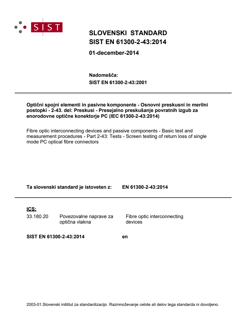 Optični spojni elementi in pasivne komponente - Osnovni preskusni in merilni postopki - 2-43. del: Preskusi - Presejalno preskušanje povratnih izgub za enorodovne optične konektorje PC (IEC 61300-2-43:2014)