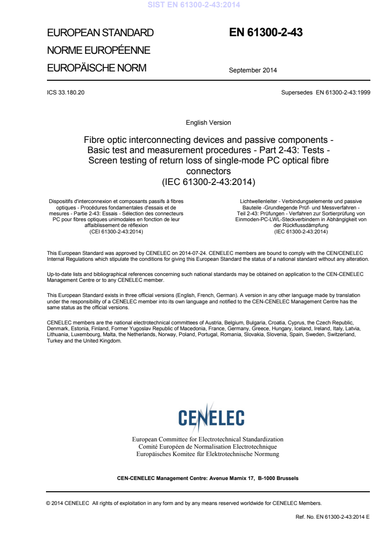 the IEC-CENELEC parallel vote and approved by CENELEC as EN 61300-2-43:2014.
