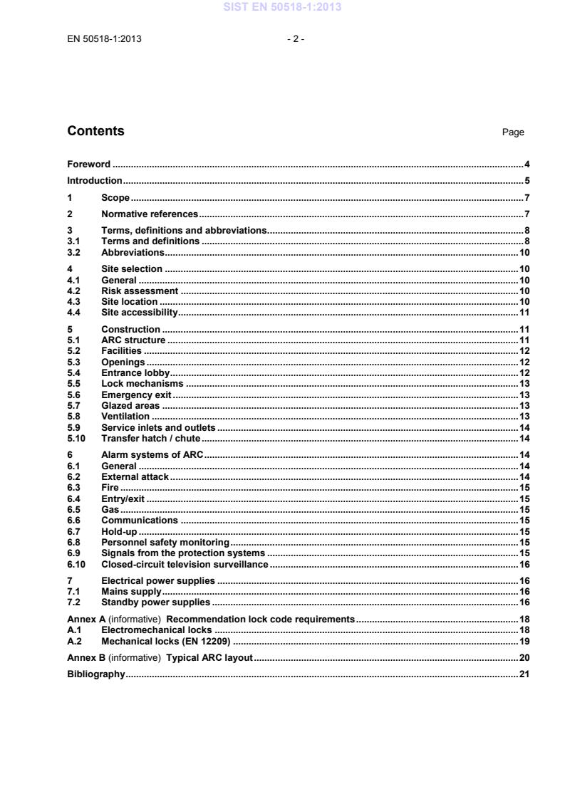 Contents Page Foreword . 4 Introduction . 5 1 Scope . 7 2 Normative references . 7 3 Terms, definitions and abbreviations. 8 3.1 Terms and definitions . 8 3.2 Abbreviations . 10 4 Site selection . 10 4.1 General . 10 4.2 Risk assessment . 10 4.3 Site location . 10 4.4 Site accessibility . 11 5 Construction . 11 5.1 ARC structure . 11 5.2 Facilities . 12 5.3 Openings . 12 5.4 Entrance lobby . 12 5.5 Lock mechanisms . 13 5.6 Emergency exit . 13 5.7 Glazed areas . 13 5.8 Ventilation . 13 5.9 Service inlets and outlets . 14 5.10 Transfer hatch / chute . 14 6 Alarm systems of ARC . 14 6.1 General . 14 6.2 External attack . 14 6.3 Fire . 15 6.4 Entry/exit . 15 6.5 Gas . 15 6.6 Communications . 15 6.7 Hold-up . 15 6.8 Personnel safety monitoring . 15 6.9 Signals from the protection systems . 15 6.10 Closed-circuit television surveillance . 16 7 Electrical power supplies . 16 7.1 Mains supply . 16 7.2 Standby power supplies . 16 Annex A (informative)