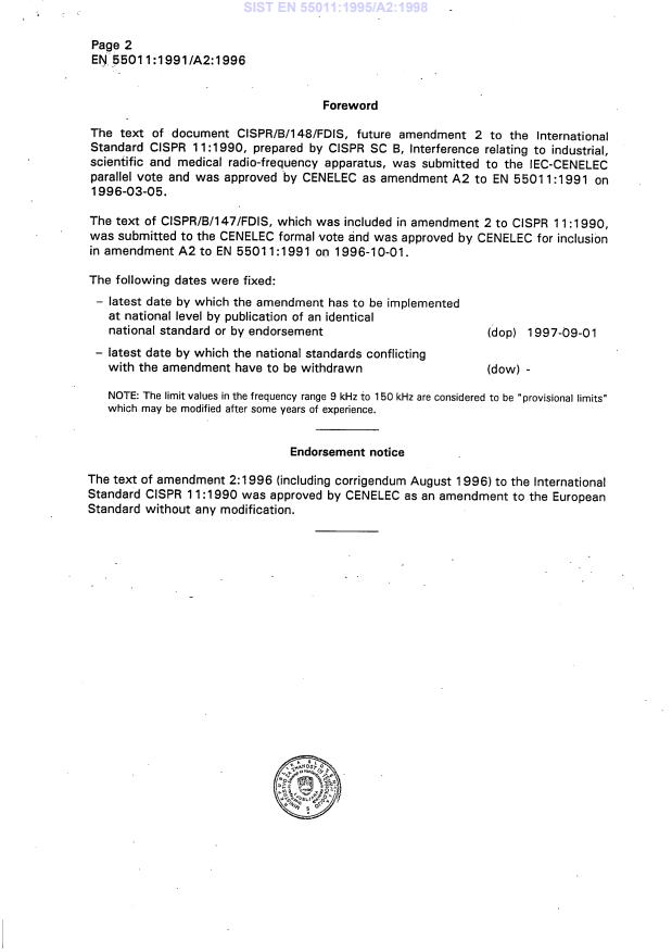 EN 55011:1991/A2:1996 is a amendment published by CLC. Its full title is "Limits and methods of measurement of radio disturbance characteristics of industrial, scientific and medical (ISM) radio-frequency equipment". This standard covers: EN following parallel vote * Incorporates AA * Superseded by EN 55011:1998 * Published under SC 210A disbanded by D115/098