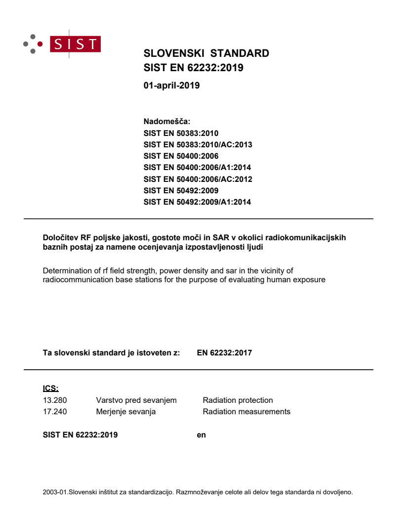 2003-01.Slovenski inštitut za standardizacijo. Razmnoževanje celote ali delov tega standarda ni dovoljeno.NRPXQLNDFLMVNLKDetermination of rf field strength, power density and sar in the vicinity of radiocommunication base stations for the purpose of evaluating human exposure17.240Merjenje sevanjaRadiation measurements13.280Varstvo pred sevanjemRadiation protectionICS:Ta slovenski standard je istoveten z:EN 62232:2017SIST EN 62232:2019en01-april-2019SIST EN 62232:2019SLOVENSKI