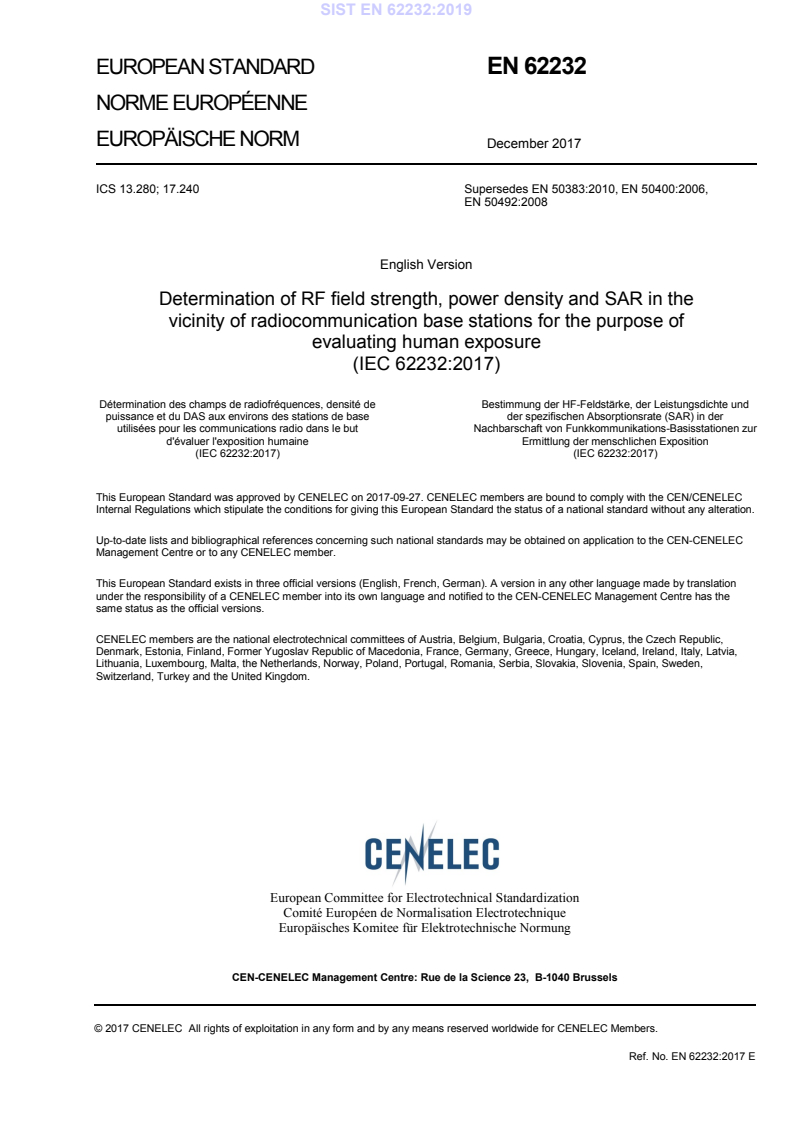 Bestimmung der HF-Feldstärke, der Leistungsdichte und der spezifischen Absorptionsrate (SAR) in der Nachbarschaft von Funkkommunikations-Basisstationen zur Ermittlung der menschlichen Exposition (IEC 62232:2017) This European Standard was approved by CENELEC on 2017-09-27. CENELEC members are bound to comply with the CEN/CENELEC Internal Regulations which stipulate the conditions for giving this European Standard the status of a national standard without any alteration. Up-to-date lists and bibliographical references concerning such national standards may be obtained on application to the CEN-CENELEC Management Centre or to any CENELEC member.