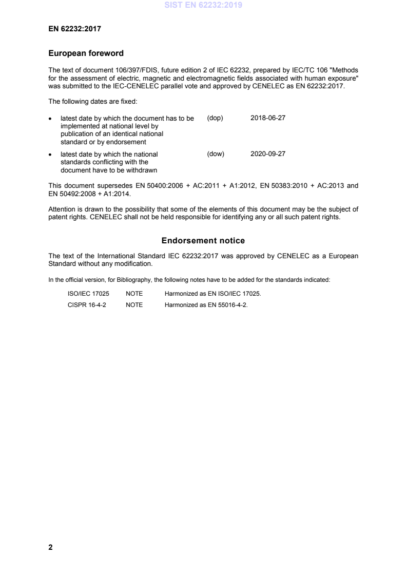 Endorsement notice The text of the International Standard IEC 62232:2017 was approved by CENELEC as a European Standard without any modification. In the official version, for Bibliography, the following notes have to be added for the standards indicated: