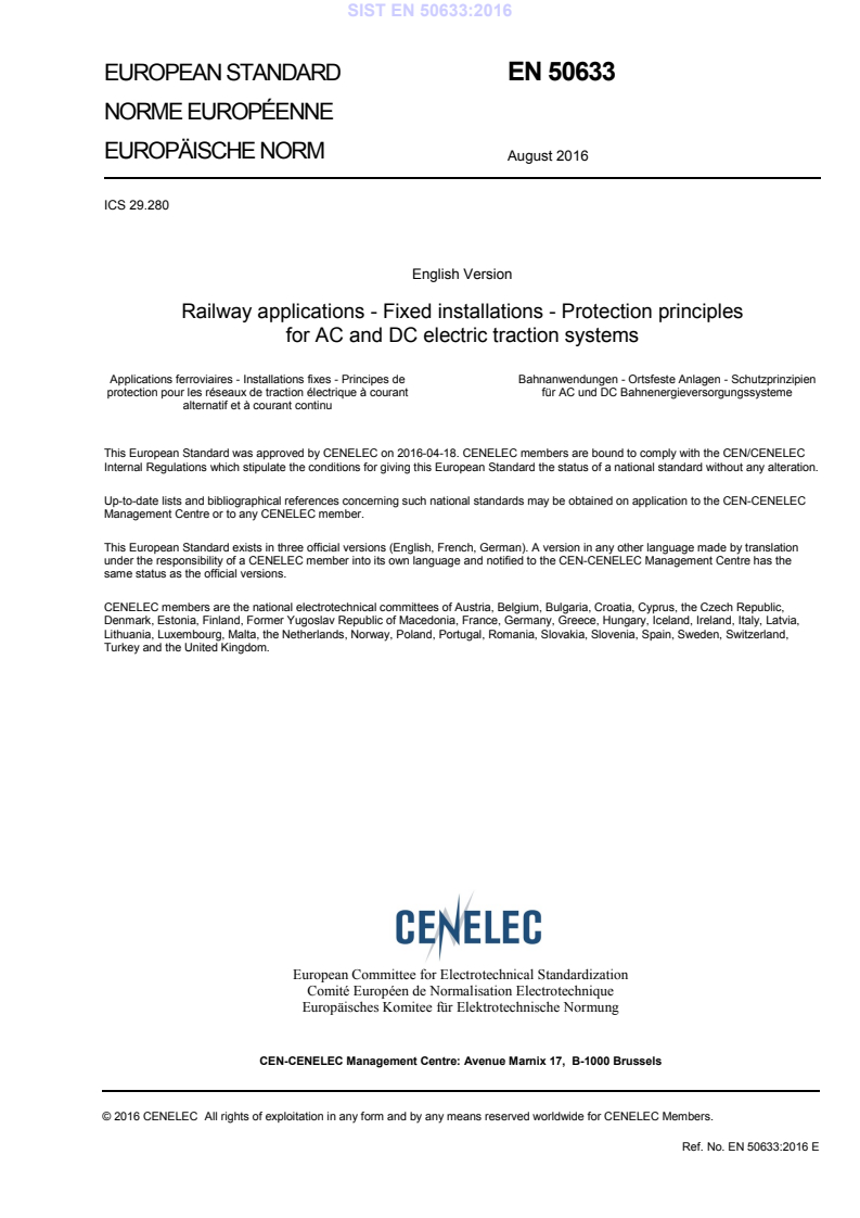 EN 50633:2016 is a standard published by CLC. Its full title is "Railway applications - Fixed installations - Protection principles for AC and DC electric traction systems". This standard covers: This European Standard applies to the electrical protection system, provided for AC and DC electric traction systems. It: - establishes railway specific protection principles; - describes the railway specific protection system functionality; - specifies minimum functional requirements and informative examples of their application; - establishes limitations of the protection system and the acceptability of residual risks; - specifies principles for conformity assessment. It applies to: - railways; - guided mass transport systems, such as tramways, elevated and underground railways, mountain railways, trolleybus systems, and magnetically levitated systems which use a contact line system. This European Standard may also be applied to electrified road traffic with a contact line, such as truck-trolley systems. This European Standard applies to new electric traction systems and may be applied to changes of existing systems. It does not apply to: - underground mine traction systems; - cranes, transportable platforms and similar transportation equipment on rails, temporary structures (e.g. exhibition structures) in so far as these are not supplied directly or via transformers from the contact line system and are not endangered by the traction power supply system; - suspended cable cars; - funicular railways; - magnetic levitated systems (without a contact line system); - railways with an inductive power supply without contact system; - railways with a buried contact system that is required to be energized only below the train to ensure safety. This European Standard does not cover: - technical requirements for products, e.g. protection devices; - rules for maintenance of protection systems.