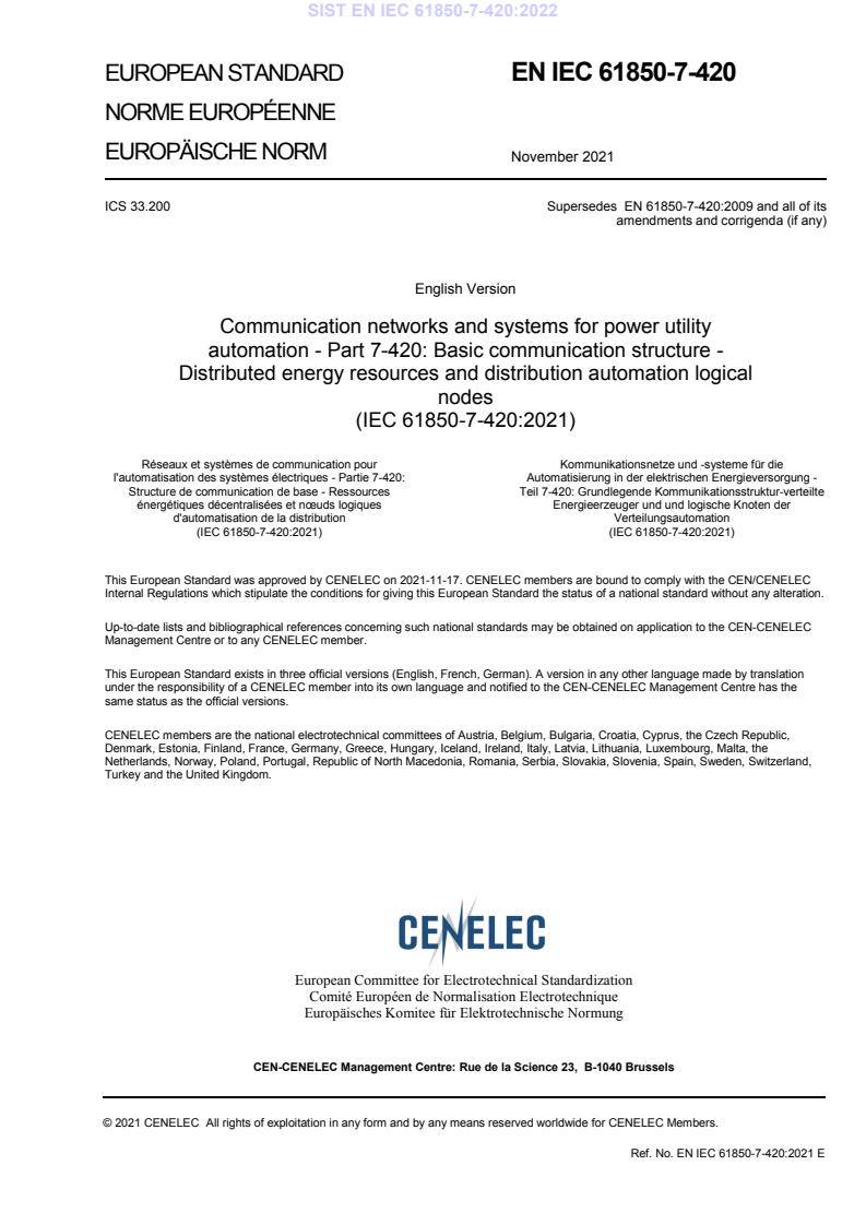 ICS 33.200 Supersedes EN 61850-7-420:2009 and all of its