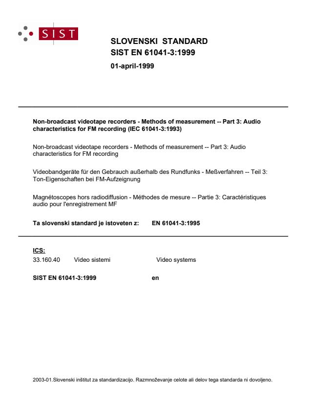 Keywords: EN 61041-3:1995, IEC 61041-3, FM audio recording, non-broadcast videotape recorders, audio measurement methods, companders, signal-to-noise ratio, frequency response, harmonic distortion, channel crosstalk, AGC.